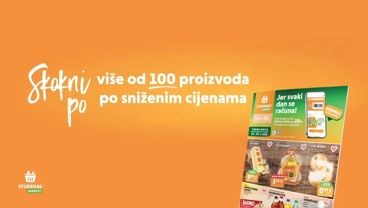 Uštedi na više od 100 proizvoda u Studenac Marketu – za svakodnevne potrebe i male zalihe koje uvijek dobro dođu. Akcija traje do 20. 1.